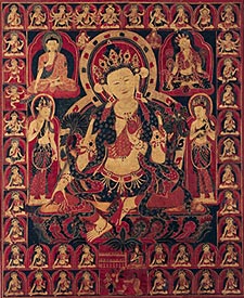 | In Sanskrit, Tara means "star" or "constellation," and thus her name emphasizes her role as a guide and saviouress on the Buddhist path to enlightenment. There are many forms of Tara (forty-six different manifestations of her appear on this painting), but the central image, Green Tara, can be identified by her posture, with her right leg pendant, and by the blue lotuses she holds, one open and one closed, in either hand. Above her left shoulder sits her other main manifestation in Tibet, White Tara, while Shakyamuni Buddha sits above her right shoulder. Green Tara is sumptuously dressed in an array of silk robes and wears pants decorated with finely drawn miniature Taras in roundels. Most of her golden jewelry and her mandorla are created in relief and would have shimmered in the light of yak-butter lamps. The patrons of this painting, a man and a woman, appear in the center of the bottom row of figures, making offerings to Green Tara. Above them sits a monk from the Sakya order of Tibetan Buddhism, possibly the person who consecrated the painting. |