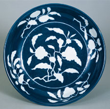 | The design on this dish is made up of a spray of camellias encircled by peaches, pomegranates, crab apple, and litchi. Although the flowers and fruits on this dish were chosen primarily for their decorative possibilities, many of these motifs have symbolic associations. For example, the pomegranate often symbolized the desire for children, the peach represents immortality, and the Chinese word for apple (ping), is a homonym for peace. The combination of these auspicious motifs and their constant reuse has led to the suggestion that dishes with such decoration were intended to be used by women. Commissioned throughout the Ming dynasty, dishes decorated with this type of motif were made in several color schemes, including blue and white, yellow and white, and more rarely, brown and white. If they were indeed made for women, it is possible that the variety in color schemes and decoration may have reflected the different statuses of the many women at the Chinese court. The six-character Xuande reign mark is on the side of the dish. The technique used in decorating this dish consists of incising a design into the porcelain body, painting the surrounding areas with blue pigment, and then covering the entire piece with a transparent glaze. |
