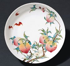 | An important element in Qing-period painted porcelains is the addition of shades of pink to the overglaze enamel palette. An opaque white derived from a lead arsenite and a pale pink were among the last opaque overglaze enamels to be developed, possibly because they are very difficult to manufacture. The pink overglaze enamels were tinted with colloidal gold (fine fragments of metal in suspension in the enamel). The range of colors used to paint this dish dating to the reign of the Yongzheng emperor illustrates the famille rose palette. 17th- and 18th-century Western fascination with the beautiful shapes, refined bodies, sophisticated colors, and elegant painting that characterize Qing-period porcelains led to the development of a series of French terms to classify these wares. Images of five bats and eight peaches embellish the dish and flow from the exterior to the interior. |